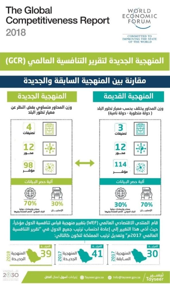 وأشار إلى أن تقدُّم ترتيب المملكة جاء بالرغم من تغيير المنتدى الاقتصادي العالمي (WEF)، لمنهجية تقرير التنافسية وزيادة عدد الدول لتصبح 140 دولة، إذ أدّى هذا التغيير إلى تأثر ترتيب العديد من دول العالم ومنها المملكة، حيث اعتمد المنتدى الاقتصادي العالمي (WEF) في منهجيته الجديدة على 98 مؤشراً لقياس تنافسية الدول لعام 2018م، منها 64 مؤشرًا تم استحداثها مؤخرًا، بينما كانت المنهجية السابقة تعتمد على 114 مؤشرًا لقياس التنافسية.