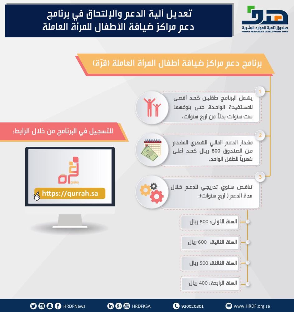 ويعد برنامج دعم مراكز ضيافة الأطفال للمرأة العاملة «قرة» مبادرة من صندوق تنمية الموارد البشرية، لدعم الكوادر النسائية الوطنية في سوق العمل والاستقرار فيه، عبر تسجيل أطفالهن في خدمة ضيافة الأطفال المرخصة.