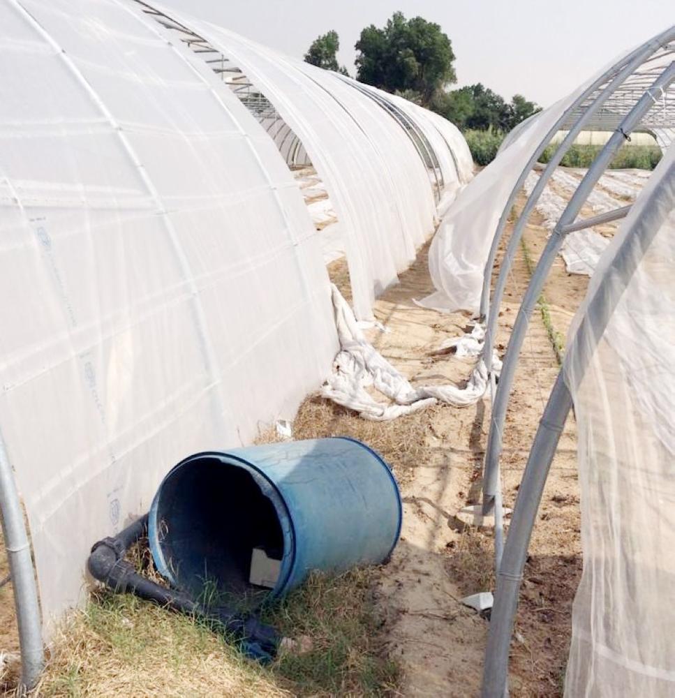 وقال: «الخسائر المادية للبيت المحمي تقدر بنحو 4 آلاف ريال تقريبا، وتتوزع الأضرار في تدمير البلاستيك بالدرجة الأولى وكذلك بعض التجهيزات الأخرى».
