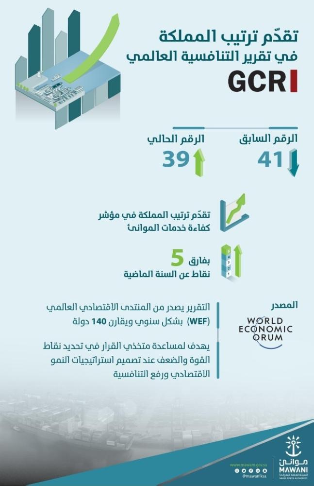 يذكر أن المملكة حققت أفضل تقدم في تقرير التنافسية العالمي GCR للعام 2018م، الصادر عن المنتدى الاقتصادي العالمي WEF، إذ حلت بالمرتبة 39 من أصل 140 دولة، ويشكل هذا التقدم التحسن الأفضل للمملكة في الترتيب منذ العام 2012م.