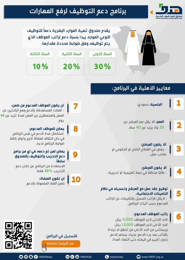 وأقر الصندوق ضوابط الدعم في البرنامج، بأن يوجه 70 % من الدعم للتوظيف و30 % لدعم التدريب، وتمتد فترة الدعم المالي لراتب الموظف إلى 36 شهرًا، بمعدل 30 % من الأجر الشهري للسنة الأولى من الدعم، و20% للسنة الثانية، و10 % للسنة الثالثة، كما تضاف نسبة إضافية للدعم، عند توظيف المنشأة للإناث أو الأشخاص ذوي الإعاقة، وعند التوظيف في المدن الصغيرة والقرى، وفي حال كان حجم المنشأة 50 عاملاً فأقل.