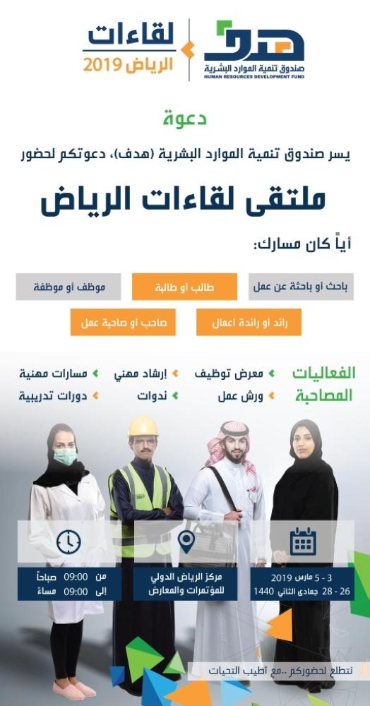 حدد صندوق تنمية الموارد البشرية (هدف)، خمسة مسارات تستهدف الباحثين والباحثات عن العمل، ورواد ورائدات الأعمال، والطلاب والطالبات، والموظفين، وأصحاب الأعمال، والأشخاص ذوي الإعاقة، في ملتقى لقاءات الرياض 2019، الذي ينظمه الصندوق في مركز الرياض الدولي للمؤتمرات والمعارض، خلال الفترة من 26 - 28 جمادى الآخرة 1440 الموافق (3 - 5 مارس 2019).