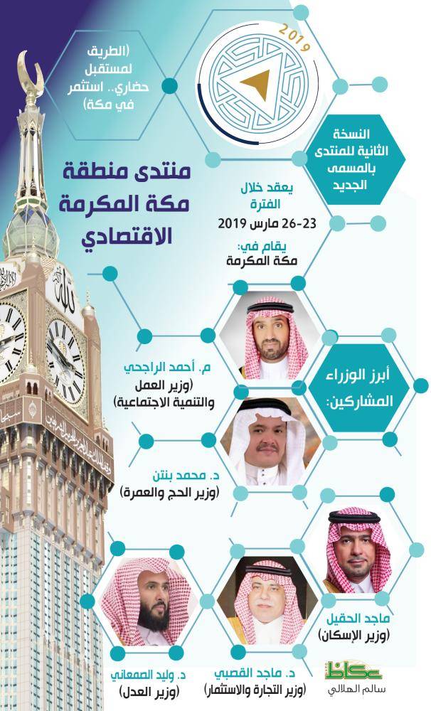 بمشاركة وزراء سعوديين و65 متحدثاً، يدشّن مستشار خادم الحرمين الشريفين أمير منطقة مكة المكرمة الأمير خالد الفيصل بحضور نائبه الأمير بدر بن سلطان غداً (السبت) في فندق هيلتون جبل عمر بالعاصمة المقدسة، منتدى منطقة مكة المكرمة الاقتصادي في دورته الثانية.
