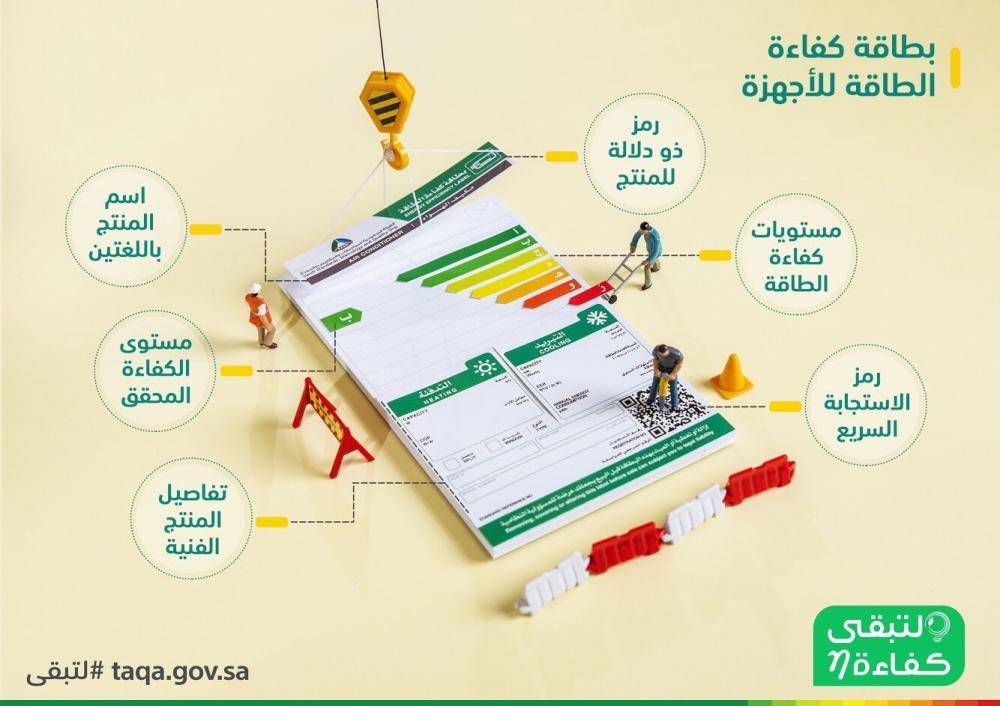 وتحتوي بطاقة كفاءة الطاقة، على جميع البيانات الفنية للجهاز المنزلي، وسعته، وحجم الاستهلاك السنوي، وبلد الصنع والعلامة التجارية، إضافة إلة رمز الاستجابة السريع، وشعار الهيئة العامة للمواصفات والمقاييس.