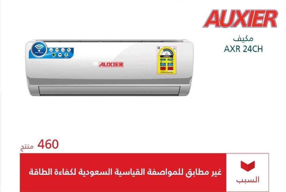 أعلنت وزارة التجارة والاستثمار استدعاء 460 منتجا لمكيف سبيليت «AUXIER» للطراز (AXR 24CH) لعدم مطابقته للمواصفة القياسية السعودية لكفاءة الطاقة.