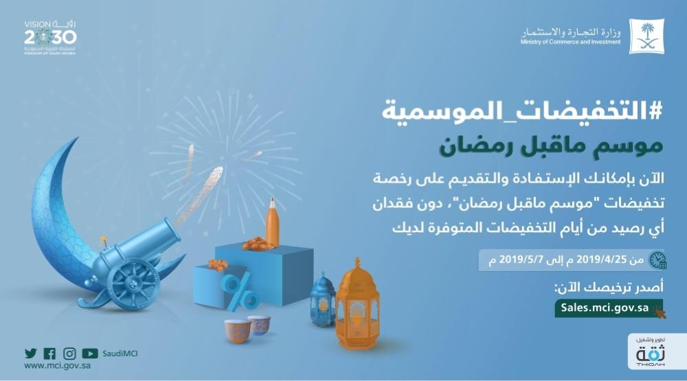أعلنت وزارة التجارة والاستثمار عن فتح نافذة التسجيل لإصدار تراخيص التخفيضات الموسمية مع قرب حلول شهر رمضان المبارك عبر نظام التخفيضات الإلكتروني وذلك خلال الفترة من 19 شعبان حتى 2 رمضان 1440هـ، الموافق 25 أبريل حتى 7 مايو 2019م.