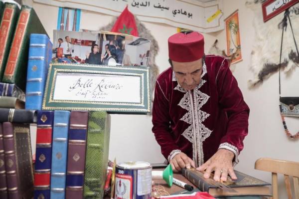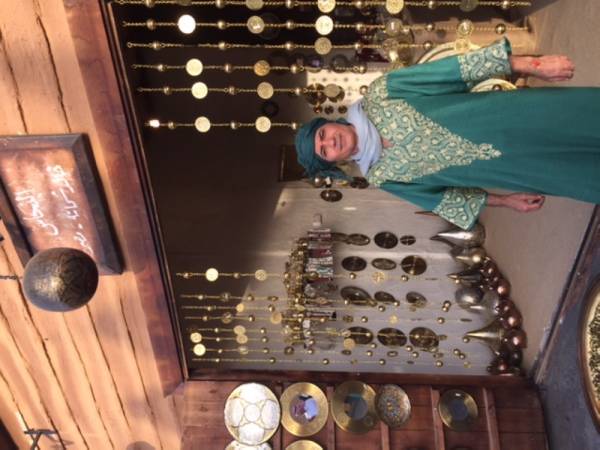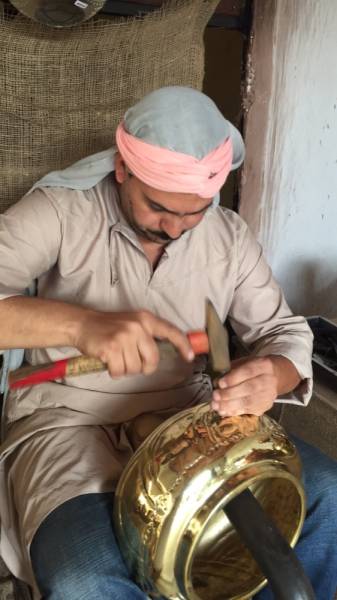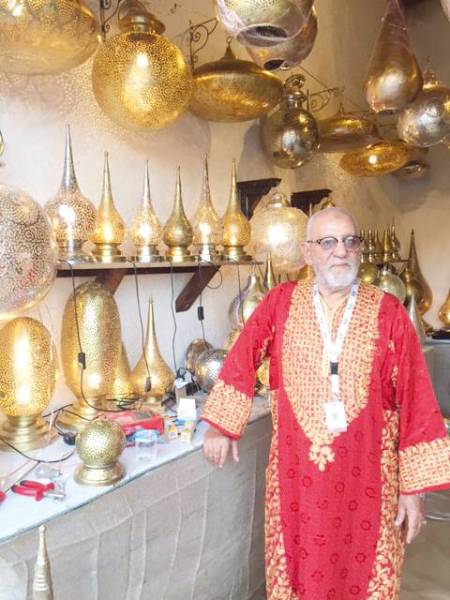 البائع محمد المهدي من المغرب يشير إلى أن أسعار نحاسياته المغربية تصل إلى 500 ريال.