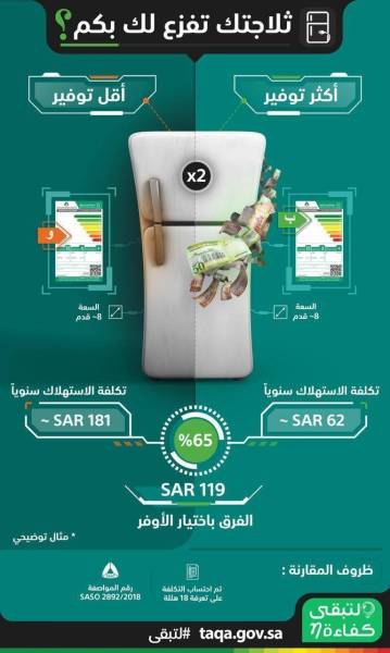 وتبلغ قيمة نسبة الوفر السابقة البالغة 65% نحو 119 ريالًا؛ حيث أن الثلاجة منخفضة الكفاءة قيمة استهلاكها السنوية تبلغ نحو 181 ريالًا، بينما الثلاجة عالية الكفاءة استهلاكها السنوي حوالي 62 ريالًا.