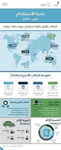 وبحسب النشرة الشهرية لـ«مُساند» فقد بلغت أقل تكلفة استقدام للعاملة المنزلية من دولتي بنغلاديش وأوغندة نحو 7 آلاف ريال، و7800 ريال للاستقدام من دولة كينيا، في حين بلغت تكلفة الاستقدام الأقل من الفلبين 14 ألف ريال، وأما الهند وفيتنام وسريلانكا فقد قاربت 18 ألف ريال، وقد سجلت أسرع مكاتب الاستقدام معدلاً تراوح بين 24 وحتى 27 يوماً لإكتمال عملية الاستقدام من هذه الدول.