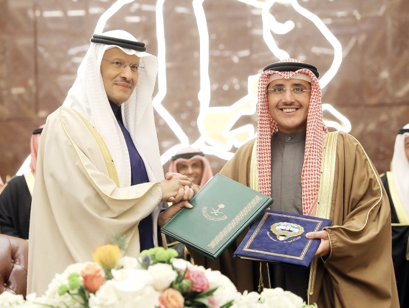 وزير الطاقة الأمير عبدالعزيز بن سلمان ووزير الخارجية الكويتي الشيخ الدكتور أحمد الصباح خلال توقيع مذكرة تفاهم لاستئناف إنتاج البترول في الجانبين.