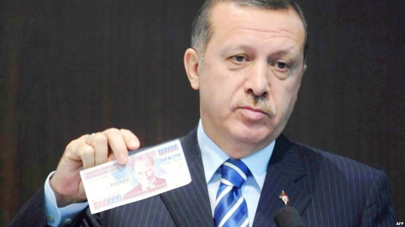 رجب أردوغان ممسكا بورقة ليرة.