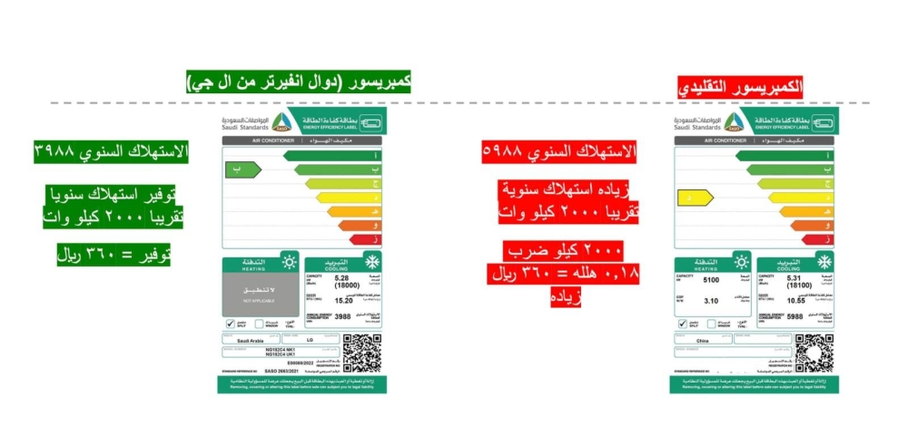 ستشهد أشهر الصيف زيادة سرعة مكيفات الهواء الخاصة بك، مما يؤدي إلى كوارث لفواتير الكهرباء الخاصة بك. وهذا هو السبب في أنه من المهم اختيار مكيف هواء يحتوي على ملصق طاقة خضراء، يسلط الضوء على كفاءة الطاقة المثلى. وتعد مجموعة مكيفات الهواء من إل جي واحدةً من العلامات التجارية الوحيدة في العالم التي لا تتوافق فقط مع نسبة كفاءة الطاقة الموسمية (SEER) للهيئة السعودية للمواصفات والمقاييس والجودة (SASO)، ولكنها تتميز أيضاً بدرجة خضراء. هذه الملصقات الموجودة على مكيفات الهواء ستعلمك بإنفاق الطاقة لكل جهاز، وهي الآن إلزامية في السوق ويمكن أن تكون مؤشراً رئيسياً في فهم كفاءة الطاقة.