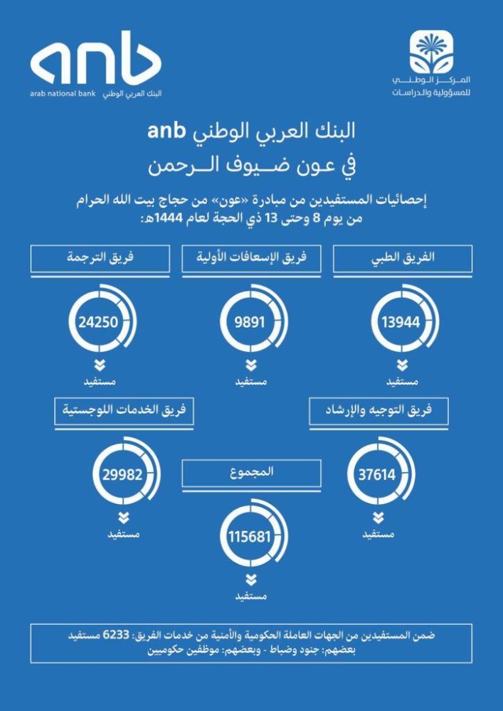 وأثمرت المبادرة التي تم إطلاقها بشراكة ودعم من البنك العربي الوطني anb وبإشراف من المركز الوطني للمسؤولية الاجتماعية بالشراكة مع وزارة الحج وعدد من الجهات الحكومية، عن تقديم الخدمات لأكثر من 115 ألف حاج ومن خلال خمسة مسارات خدمية توزعت بين: «الخدمات الصحية والطبية، الإسعافات الأولية، الترجمة بعدة لغات، التوجيه والإرشاد إلى جانب الدعم اللوجستي».