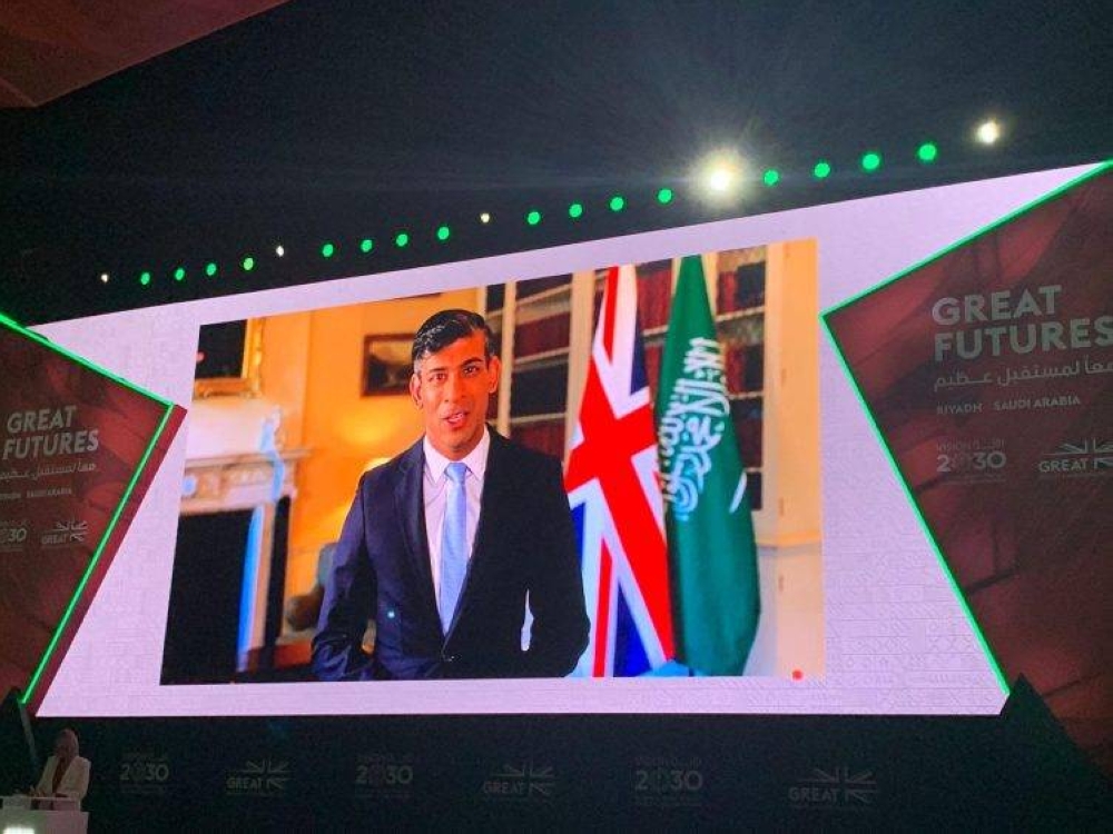 وشدد رئيس الوزراء البريطاني ريشي سوناك في كلمة ألقاها عبر الفيديو أمام منتدى (مستقبل عظيم) على أن العلاقات السعودية - البريطانية قوية وطموحة، ومنتدى مستقبل عظيم هو فرصة حقيقية لتقديم كل الدعم لطموحات رؤية 2030.