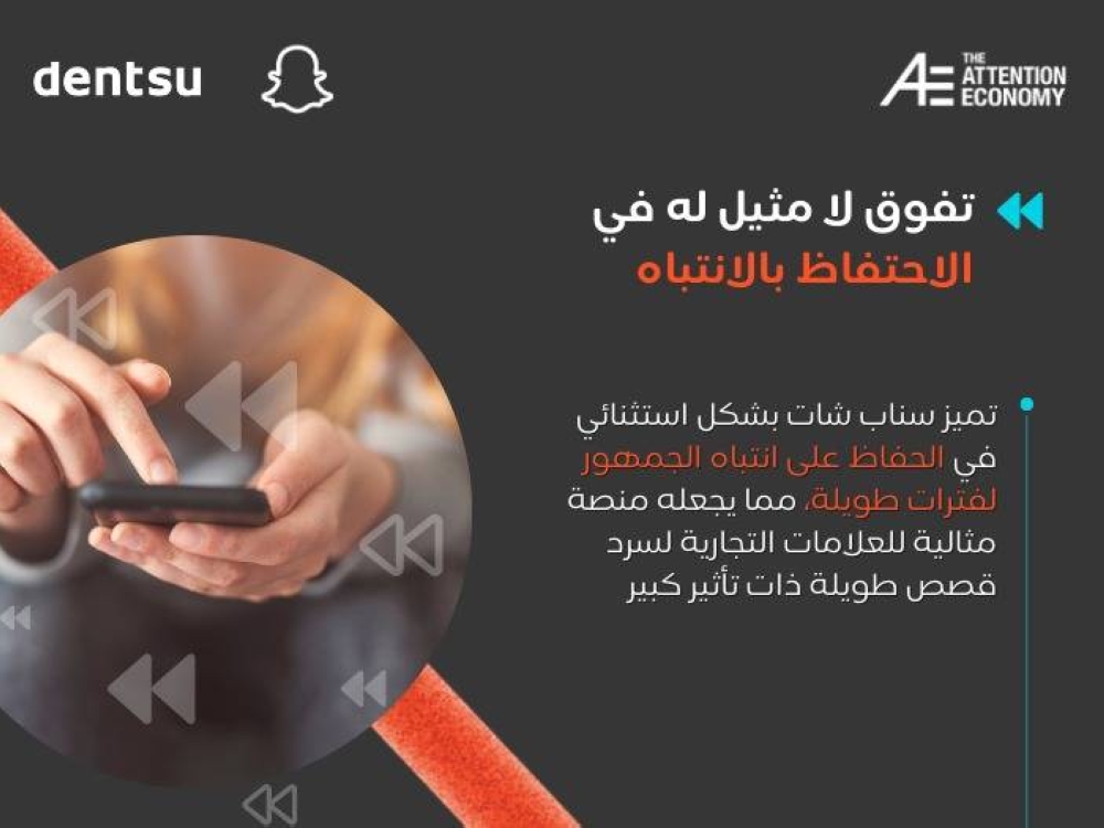 أصدرت دنتسو الشرق الأوسط وشمال أفريقيا، اليوم، رؤى جديدة من دراستها «استكشاف عملة الانتباه في السعودية»، والتي تبرز الدور القوي لسناب شات في جذب انتباه الجمهور في منطقة الشرق الأوسط وشمال أفريقيا. تم تنفيذ الدراسة بالتعاون مع لومن للأبحاث، وتسلط الضوء على مزايا تنسيق شكل الإعلانات ذات الشاشة الكاملة في سناب شات، مؤكدة كيف يمكن للعلامات التجارية الاستفادة من ميزاته الفريدة لتعزيز التفاعلات الحقيقية والمؤثرة مع المستهلكين في السعودية.