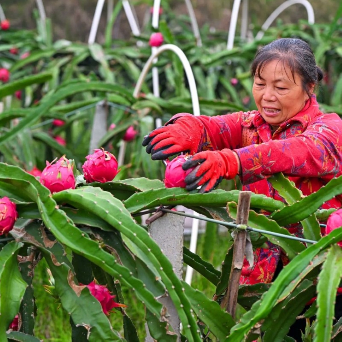 The pitaya trees in the village of Diaoxing in Sichuan Province, China, are witnessing a bountiful harvest. Fruit farmers are busy picking, transporting, and supplying the market with them. In the picture, a female farmer is seen picking pitaya fruits. (Chinese Economy Daily)