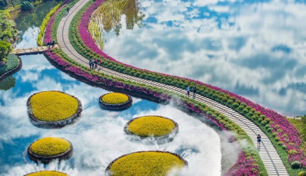 اتجهت بعض الجهات البلدية في الصين إلى تخصيص مناطق سياحية ذات مناظر طبيعية خلابة؛ بهدف جذب الزوار والسياح من داخل البلاد وخارجها. وتُظهر الصورة ممراً يُعرف باسم «بحر الزهور»، يضم ممراً طويلاً مخصصاً لمحبي السير لمسافات طويلة وسط الطبيعة.