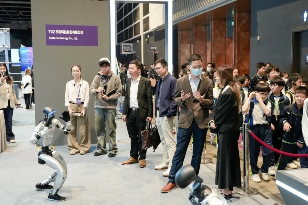 تواصل العديد من الشركات تطوير الروبوتات المهيأة للقيام بالأعمال المختلفة، مدعومة بالذكاء الاصطناعي. وتظهر الصورة مجموعة من الزوار في «هونغ كونغ» خلال اطلاعهم على أحدث مواصفات الروبوت. (إيكونومي دايلي الصينية)