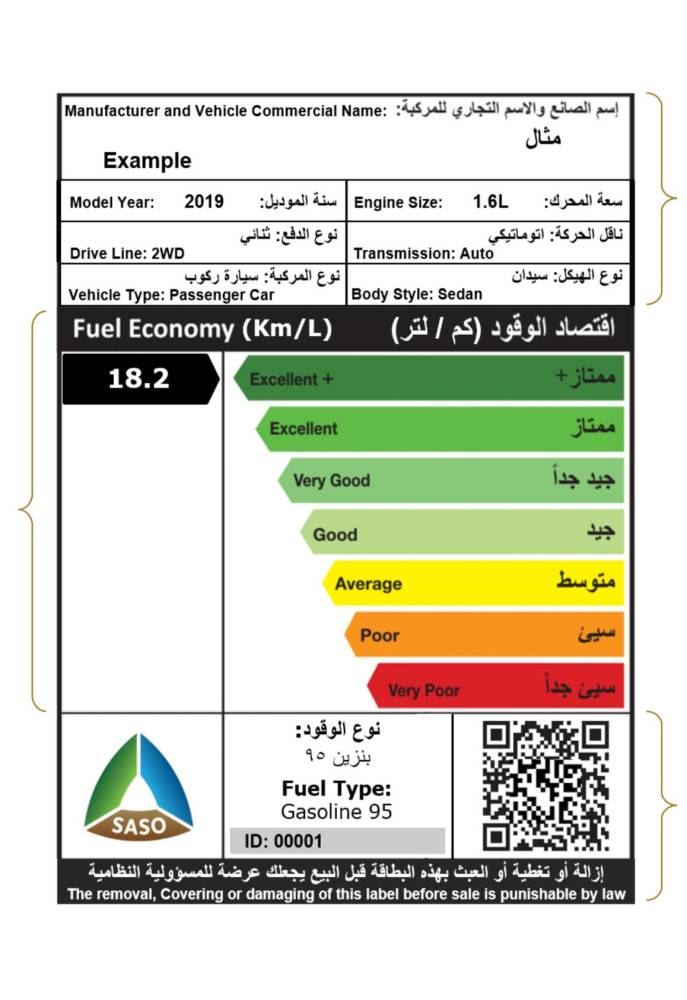 ودعا إلى قراءة «بطاقة اقتصاد الوقود للمركبات» عند الرغبة في شراء مركبة جديدة، حيث تُظهر البطاقة قيمة اقتصاد الوقود لكل طراز من المركبات، إلى جانب المستوى المقابل لهذه القيمة (أعلاها «ممتاز+ - وممتاز» باللون الأخضر، وأدناها «سيئ جداً» باللون الأحمر)، حيث يمثل المستوى الأعلى (ممتاز+) أعلى مستوى لمعدلات اقتصاد الوقود في المملكة، ويمثل المستوى الأدنى (سيئ جداً) أدنى مستوى لمعدلات اقتصاد الوقود في المملكة.