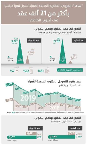 كما نما حجم التمويل في أكتوبر 2019 بنسبة 172% على أساس سنوي بقيمة 9.3 مليار ريال، مقابل نحو 3 مليارات ريال في أكتوبر 2018 بزيادة بأكثر من 5.8 مليار ريال، وسجلت القروض السكنية الجديدة في شهر أكتوبر 2019 نمواً بنحو 30% مقارنة بشهر سبتمبر 2019 في حجم التمويل، ونحو 29% في عددها.