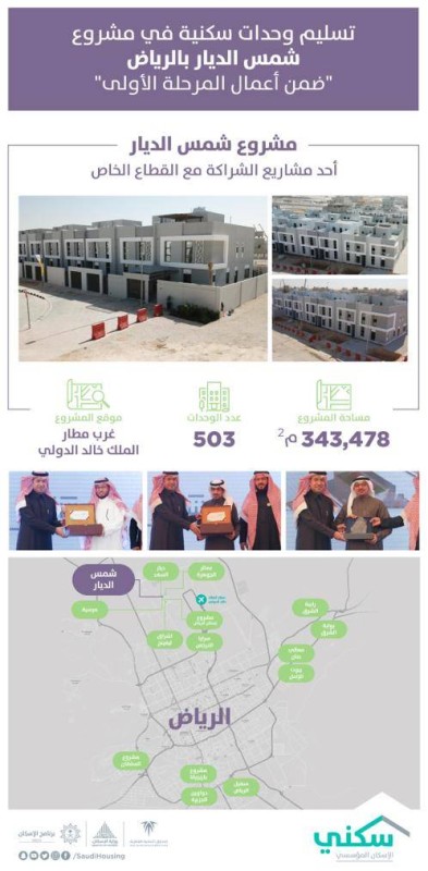 ويأتي تسليم عدد من الوحدات السكنية في مشروع «شمس الديار» استكمالاً لما تم تسليمه مسبقاً في عدد من المشاريع تحت الإنشاء، مثل مشروعي «نساج تاون» و«الواجهة» في المنطقة الشرقية، و«رُبى جدة» في منطقة مكة المكرمة، وسيتبعها المزيد من المشاريع في إطار حرص الوزارة عبر برنامج «سكني» على تمكين الأسرة السعودية من التملك بالاستفادة من الخيارات السكنية المتنوعة.
