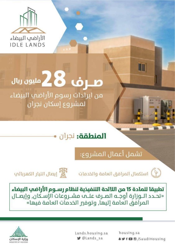 كشف برنامج «الأراضي البيضاء» التابع لوزارة الإسكان صرفه نحو 28 مليون ريال، لاستكمال تنفيذ وإيصال خدمات البنية التحتية في مشروع إسكان نجران، مبيناً أن هذا المبلغ يمثل جزءا من إيرادات البرنامج التي جرى تحصيلها من الرسوم المفروضة على الأراضي البيضاء داخل النطاق العمراني في المدن الخاضعة للنظام في مرحلته الأولى.
