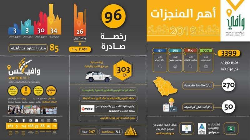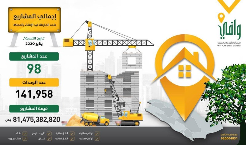 أعلن برنامج البيع والتأجير على الخارطة (وافي) وصول عدد المشاريع السكنية التي يشرف عليها في سوق الإسكان حتى نهاية 2019 إلى 98 مشروعاً توفر أكثر من 142 ألف وحدة سكنية تحت الإنشاء، وذلك بقيمة إجمالية تصل إلى 81 مليار ريال، فيما أصدر البرنامج رخصاً للبيع لأكثر من 30 ألف وحدة سكنية من منتجات البيع على الخارطة التابعة للقطاع الخاص خلال العام الماضي 2019.