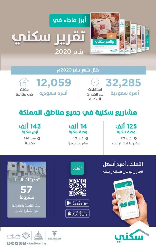 أصدر برنامج «سكني» التابع لوزارة الإسكان تقريره الشهري الأول خلال هذا العام 2020، واستعرض التقرير أبرز منجزات البرنامج لشهر يناير الماضي، حيث تضمن تفاصيل أعداد الأسر التي استفادت من الخيارات السكنية والحلول التمويلية التي قدمها البرنامج خلال شهر يناير الماضي بعدد 32.285 أسرة، منها 12.059 أسرة تمكنت من السكن، ويمكن الاطلاع على التقرير كاملاً من خلال زيارة الموقع الإلكتروني للبرنامج أو الرابط https://sakani.housing.sa/sakani-reports.