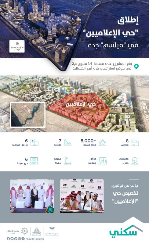 أعلن مشروع «مياسم» في أبحر شمالي جدة، تخصيص حي للإعلاميين ضمن نطاق المشروع الذي يمتد على مساحة 1.6 مليون متر مربع بالقرب من برج جدة، وذلك في إطار الاتفاقية الموقعة مسبقاً بين وزارتي الإسكان والإعلام، والمتضمنة عدداً من المزايا للإعلاميين بينها إنشاء أحياء سكنية مخصصة لهم في كل من الرياض وجدة والدمام كمرحلة أولى.