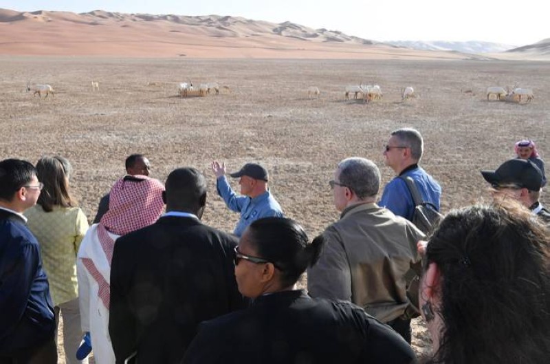 وزار السفراء محمية حقل شيبة التي تنتشر فيها قطيع من المها العربي والنعام إلى جانب الاستمتاع بالعروق الرملية والتنزه في المناطق الطبيعية.