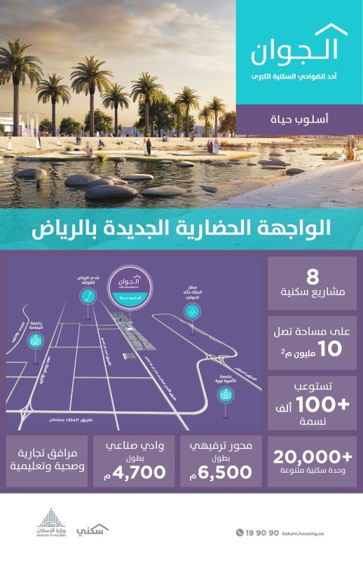 أعلن برنامج سكني، التابع لوزارة الإسكان، وصول نسب الحجوزات في مشاريع ضاحية الجوان الواقعة شمال الرياض إلى أكثر من 44%، منوهاً إلى أن الضاحية ستشهد اكتمال تنفيذ نحو 4600 وحدة خلال العام الحالي 2020، تمهيداً لتسليمها للمستفيدين.