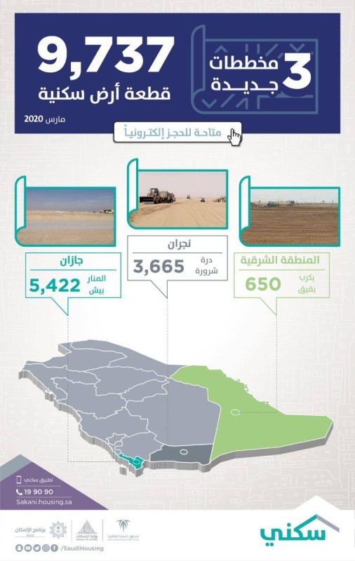 وأوضح برنامج «سكني» في بيانٍ صحفي اليوم (الأربعاء)، أنه فعَّل الاختيار الإلكتروني لـ 3 مخططات جديدة موزعة على 3 مناطق توفر 9737 قطعة أرض، ولفت إلى أن المخططات الجديدة تضمنت مخطط «يكرب» بمحافظة بقيق التابعة للمنطقة الشرقية الذي يوفر 650 قطعة، ومخطط «مشروع المنار» بمحافظة بيش التابعة لمنطقة جازان الذي يوفر 5422 قطعة أرض، ومخطط «درة شرورة» في محافظة شرورة التابعة لمنطقة نجران ويحوي 3665 قطعة أرض سكنية متاحة للحجز من قبل المواطنين إلكترونياً.