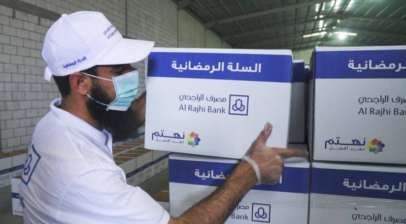 اعتمد مصرف الراجحي هذا العام كإحدى مبادرات المسؤولية الاجتماعية برنامج توزيع سلال غذائية على المحتاجين قبل دخول شهر رمضان المبارك، وجرت العادة في الأعوام السابقة أن يقوم الموظفون بالتطوع بتعبئة وتجهيز السلال، ثم يتولى الموظفون والموظفات في المصرف بقيادة سفراء المسؤولية الاجتماعية في المناطق توزيع هذه السلال على المحتاجين في مناطقهم، إلا أن جائحة كورونا حالت دون ذلك هذا العام، إذ تم توزيع السلال الرمضانية من خلال سفراء المسؤولية الاجتماعية مباشرة إلى الجمعيات ذات العلاقة في مناطقهم.