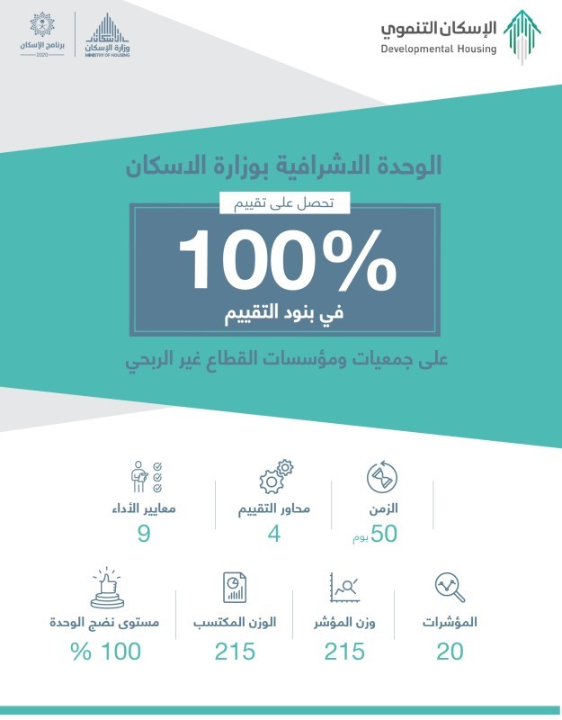 حقق برنامج الإسكان التنموي التابع لوزارة الإسكان أعلى معايير التقييم في جميع بنود التقييم الإشرافية على جمعيات ومؤسسات القطاع غير الربحي الإسكانية بنسبة 100%، بعد تقديمه لخطة أداء متكاملة وفقا لمعايير التقييم التي تشرف عليها وزارة الموارد البشرية والتنمية الاجتماعية.
