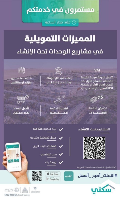 ويُقدم «سكني» جُملة من المميزات التمويلية للحصول على قرض عقاري مدعوم الفائدة بنسبة تصل 100% لشراء وحدات سكنية تحت الإنشاء تمتاز بتنوع تصاميمها ونماذجها ضمن 80 مشروعاً توفر أكثر من 132 ألف وحدة، يأتي من أهمها تحمل الدولة لضريبة القيمة المضافة للمسكن الأول، وإعفاء سداد قيمة العقار في حال الوفاة أو العجز الكلي، وسداد القسط الشهري بمرونة ليكون متزايداً أو متناقصاً.