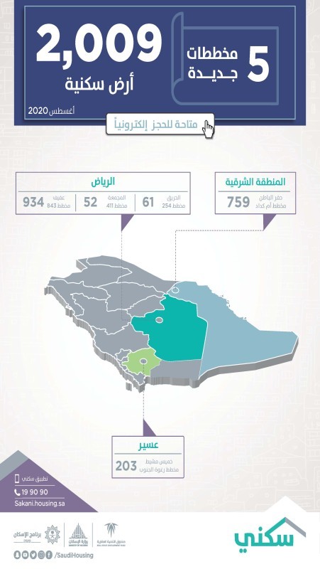 وأوضح برنامج «سكني» في بيان صحفي اليوم، أنه فعَّل الاختيار الإلكتروني لـ5 مخططات جديدة مُوزعة على 3 مناطق توفر 2009 قطع أراضٍ، 3 منها في منطقة الرياض هي مُخطط «عفيف 843» في محافظة عفيف والذي يوفر 934 أرضاً سكنية، كذلك «مخطط 254» في محافظة الحريق ويضّم 61 قطعة أرض، و«مخطط 411» في محافظة المجمعة والذي يوفر 52 قطعة أرض سكنية متاحة للحجز إلكترونيا.
