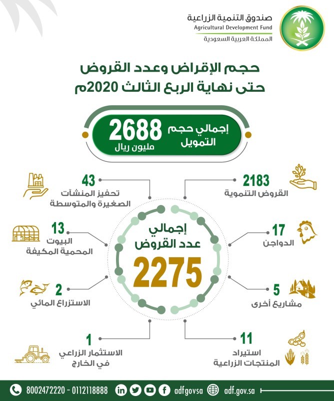 كشف صندوق التنمية الزراعية إجمالي حجم التمويل الذي تمت الموافقة عليه منذ بداية العام الحالي 2020 وحتى نهاية الربع الثالث، بقيمة إجمالية بلغت 2688 مليون ريال، بينما بلغ إجمالي عدد القروض 2275 قرضاً.