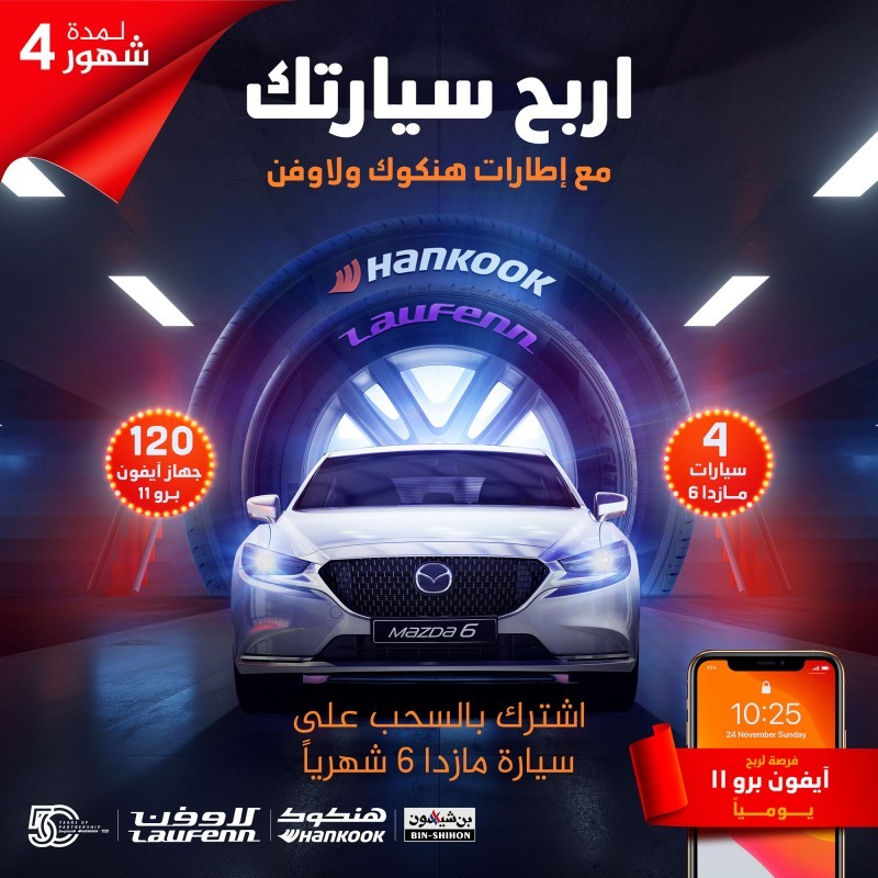 وتزامناً مع هذا الحدث، أطلقت مجموعة بن شيهون حملة ضخمة لإطارات «هنكوك» و«لاوفن» احتفالاً بهذه المناسبة، حيث ستستمر لمدة أربعة أشهر تقدم في خلالها أجهزة آيفون 11 برو كجوائز يومية و4 سيارات مازدا 6 كجوائز شهرية، وسيتم الإشراف على الحملة بالكامل من جانب غرفة جدة، حيث إن المطلوب من عملاء الشركة للاشتراك في هذه الحملة ودخول السحب هو الدخول على الرابط https://hankook50.com/ والتسجيل في السحب على جوائز الحملة القيمة.