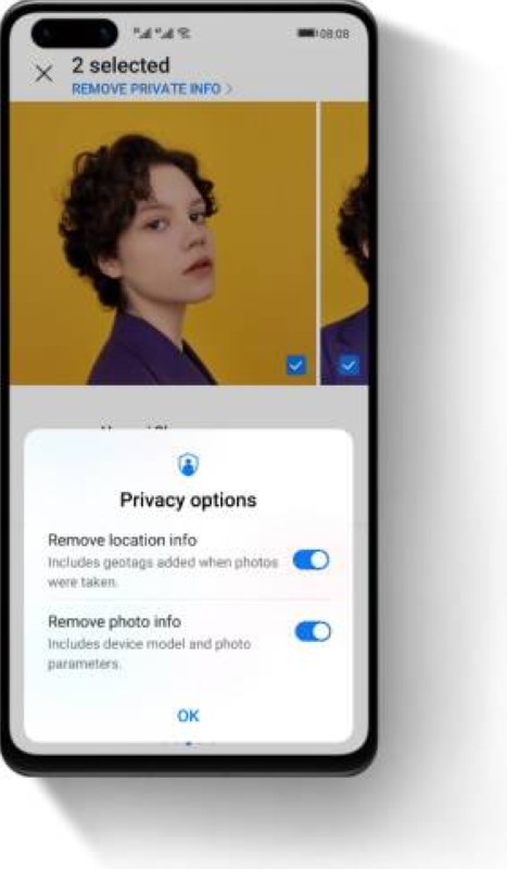 كيف يفترض بنا استخدام وسائل التواصل الاجتماعي دون نشر هذه المعلومات في جميع أنحاء الإنترنت؟ هنا يأتي دور Photo Safe Sharing - ميزة مشاركة الصور الآمنة من هواوي. مدمجة في واجهة المستخدم EMUI 11، في كل مرة تنقر فيها على مشاركة في معرض صور هواوي على هاتفك، يمكنك الآن رؤية أيقونة زرقاء في الزاوية اليسرى العليا والتي ستظهر خيارات الخصوصية. ما عليك سوى النقر فوق الرمز ويمكنك تحديد إزالة معلومات الصورة وإزالة معلومات الموقع.
