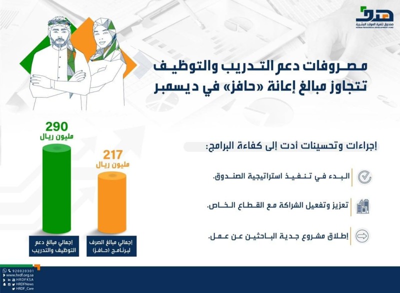 كشف صندوقُ تنمية الموارد البشرية «هدف» أنَّ إجمالي مبالغ الدعم المصروفة على برامج ومبادرات دعم التدريب والتوظيف والتمكين وصلت إلى 290 مليون ريال، خلال شهر ديسمبر (2020)، متجاوزة للمرة الثانية على التوالي مبالغ الدعم المصروفة على برنامج إعانة البحث عن عمل «حافز»، التي بلغت 217 مليون ريال، للفترة ذاتها.