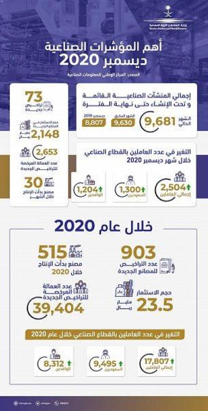 كشفت وزارةُ الصناعة والثروة المعدنية في تقرير مؤشراتها السنوي لعام 2020م أن عدد التراخيص الصناعية الجديدة التي أصدرتها الوزارة للمصانع خلال العام الماضي بلغ 903 تراخيص، بحجم استثمارات يصل إلى 23.5 مليار ريال، فيما بدأ 515 مصنعاً أعمال الإنتاج في العام نفسه.