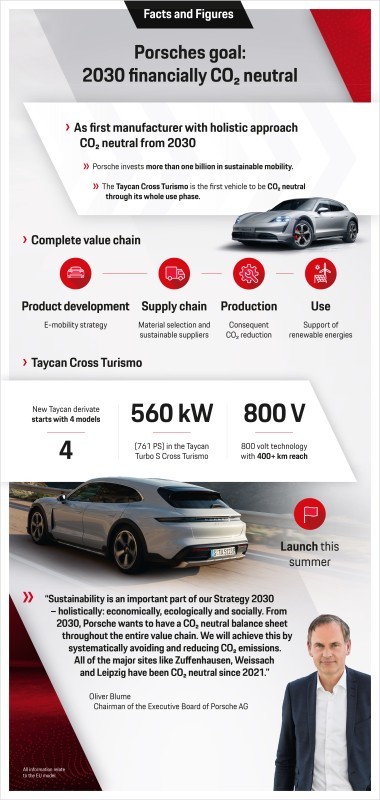 في مواجهة التغير المناخي المستمر، حددت بورشه إيه جي لنفسها هدفاً طموحاً آخر. وقال أوليفر بلومه بهذا الخصوص: الاستدامة الشاملة جزء مهم من استراتيجيتنا للعام 2030، اقتصادياً وبيئياً واجتماعياً. وأضاف: أطلقنا برنامجاً شاملاً للتخلص من انبعاثات الكربون مع وضع هدف راسخ في الاعتبار: تريد بورشه أن تكون سلسلة القيمة بأكملها محايدة لثاني أكسيد الكربون بحلول العام 2030. وسوف نحقق ذلك من خلال التجنب والخفض المنتظم لانبعاثات ثاني أكسيد الكربون. وأصبحت جميع مواقع الشركة الرئيسية مثل زوفنهاوزن وفايساخ ولايبزيغ محايدة للكربون منذ العام 2021، وخصصنا أكثر من مليار يورو للتخلص من انبعاثات الكربون على مدى السنوات العشر القادمة. ووصلنا بالفعل إلى تحقيق المرحلة الأولى، حيث تعتبر سيارة تايكان كروس توريزمو، التي تم عرضها لأول مرة على مستوى العالم في بداية شهر مارس، أول سيارة محايدة لثاني أكسيد الكربون طوال فترة استخدامها.