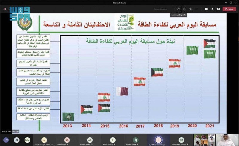 كرمت أمانة المجلس الوزاري العربي للكهرباء- المنبثقة عن القطاع الاقتصادي بالأمانة العامة لجامعة الدول العربية في اجتماعها الذي عُقد عن بعد اليوم- مبادرة أجهزة التكييف عالية الكفاءة بالمركز السعودي لكفاءة الطاقة، التي فازت بالمركز الأول في مسابقة اليوم العربي لكفاءة الطاقة 2021م.