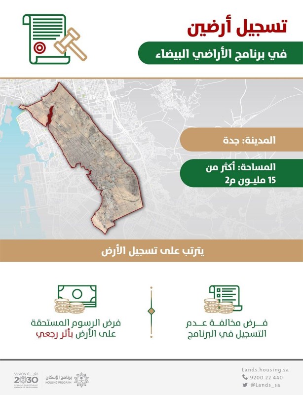 أعلن برنامج «الأراضي البيضاء» تسجيله أرضين في محافظة جدة بمساحة إجمالية بلغت 15,3 مليون متر مربع، بعد رصد عدم تسجيلها في النظام ضمن المرحلة الأولى التي تُعنى بالأراضي غير المطورة «الخام» بمساحة 10 آلاف متر مربع وأكثر، والواقعة ضمن النطاق المعلن عنه في المدن التي طُبِّق النظام فيها.
