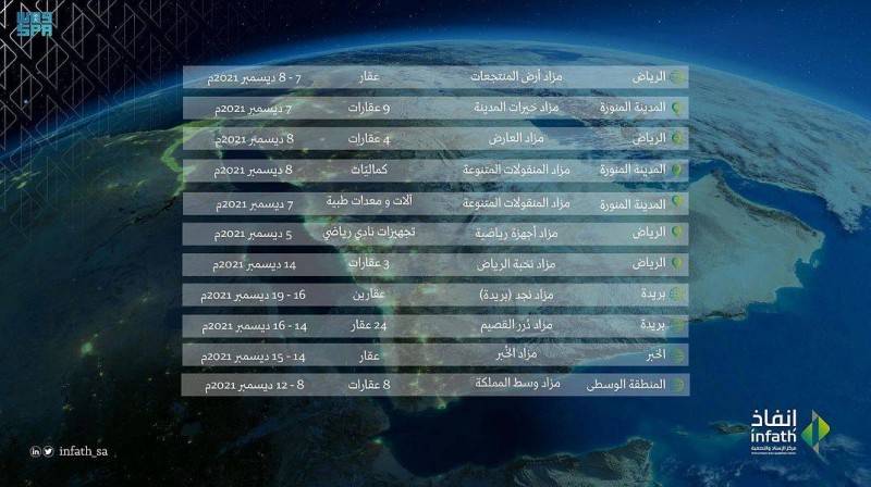وتبدأ المزادات بـ«مزاد أرض المنتجعات» الإلكتروني المقام على عقار واحد، و«مزاد العارض» الحضوري المقام على 4 عقارات، و«مزاد نخبة الرياض» الحضوري المقام على 3 عقارات في مدينة الرياض، و«مزاد خيرات المدينة» الحضوري المقام على 9 عقارات في المدينة المنورة، و«مزاد وسط المملكة» الإلكتروني المقام على 8 عقارات في (بريدة، عنيزة، الرس، المجمعة، حريملاء)، و«مزاد نجد» الإلكتروني المقام على عقارين، و«مزاد درر القصيم» الإلكتروني المقام على 24 عقارًا في مدينة بريدة، و«مزاد الخبر الإلكتروني» المقام على عقار في مدينة الخبر، إضافة إلى 3 مزادات للمنقولات، تبدأ بـ «مزاد المنقولات المتنوعة» على بضاعة محل كماليات، و«مزاد مجمع المدينة الطبي» المقام على أجهزة ومعدات طبية في المدينة المنورة، و«مزاد الأجهزة الرياضية» المقام على تجهيزات نادٍ رياضي يقع في مدينة الرياض.