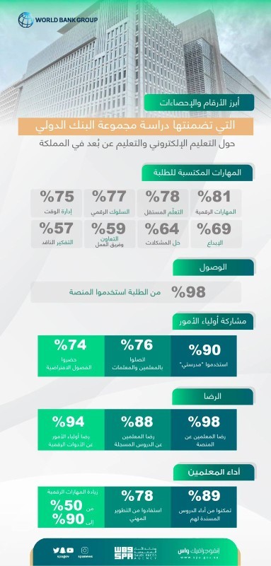 وأشارت مجموعة البنك الدولي إلى فاعلية التعليم عن بُعد في بناء المهارات التكنولوجية، ومحو الأمية الرقمية، ومهارات التعلم المستقِل، بالإضافة إلى قواعد السلوك الرقمية وإدارة الوقت، لافتةً إلى أن التعليم الإلكتروني بالمملكة وعلى الرغم من التحديات والظروف الاستثنائية التي فرضتها الجائحة؛ سجل حضوراً وتفاعلاً قوياً على مستوى الطلبة والمعلمين والمعلمات، حيث تمكن 98% من الطلبة من الوصول إلى «مدرستي»، في حين وجد 89% من مديري المدارس أن نسبة غياب المعلمين كانت أقل مما كانت عليه في السنوات السابقة، في مقابل 59% من المعلمين الذين عبروا عن إشكالية ضعف الاتصال بشبكة الإنترنت التي واجهتهم في بعض الأحيان مما شكل عائقاً في الوصول إلى الفصول الافتراضية.