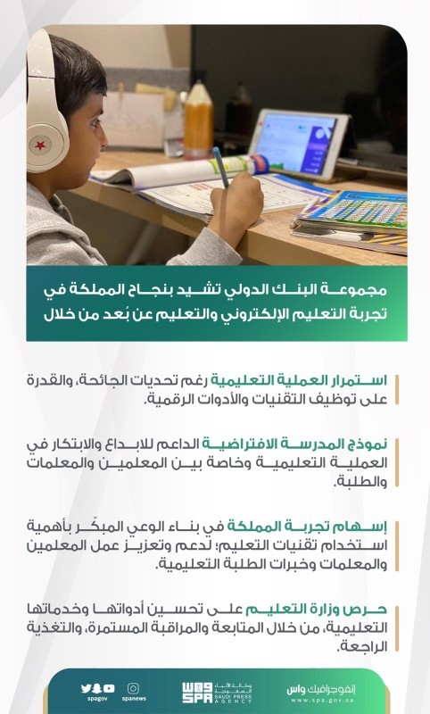 نوّهت مجموعة البنك الدولي خلال دراستها الاستقصائية بعنوان (التعليم الرقمي والتعليم عن بُعد في المملكة العربية السعودية.. تجارب من وباء كورونا وفرص تحسين التعليم) بجهود المملكة في تطوير منظومة التعليم، وما حققته من نجاحٍ مميزٍ في تجربة التعليم الرقمي والتعليم عن بُعد خلال جائحة كورونا، وذلك من خلال استثمار الحلول البديلة والتقنيات الرقمية؛ لاستمرار العملية التعليمية بجميع المراحل الدراسية، لافتةً إلى حرص وزارة التعليم على تحسين أدواتها وخدماتها التعليمية، من خلال المتابعة المستمرة لبيانات المستخدمين على منصاتها التعليمية الإلكترونية، وحلقات التغذية الراجعة.