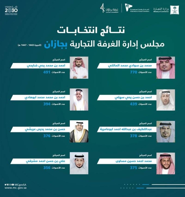 وأقرت اللجنة المشرفة على انتخابات مجلس إدارة غرفة جازان اعتماد فوز 8 مترشحين في الانتخابات هم: محمد بن سوادي محمد المالكي 770 صوتا، أحمد بن محمد يحيى ضويحي 491 صوتا، أحمد بن حسن يحيى سهلي 439 صوتا، أحمد بن محمد محمد أبو هادي 394 صوتا، عبداللطيف بن عبدالله أحمد أبو عامرية 378 صوتا، حسن بن محمد يحيى عريشي 376 صوتا، محمد أحمد حسين مساوى 375 صوتا، علي بن حسن أحمد مشرقي 365 صوتا. وبلغ إجمالي عدد الأصوات في انتخابات غرفة جازان 6279 صوتا، فيما بلغ عدد المصوتين 2314 ناخباً وناخبة.