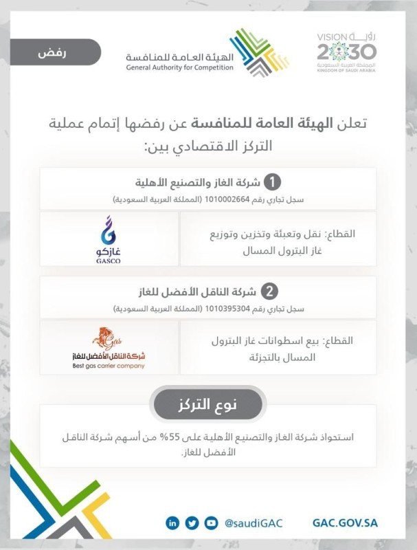 أعلنت الهيئة العامة للمنافسة اليوم رفضها صفقة استحواذ شركة الغاز والتصنيع الأهلية على 55% من شركة الناقل الأفضل للغاز. وأفادت الهيئة في بيانها بأن شركة الغاز والتصنيع الأهلية تعد في الوقت الحالي محتكرة لسلسلة إمداد الغاز في مراحل التخزين والتعبئة والتوزيع والبيع بالجملة، وتمتلك في حال أجيزت الصفقة بسبب وضعها المهيمن المقدرة والحافز في التأثير «عالي الاحتمال» على سلسلة إمداد التوزيع والبيع بالتجزئة وذلك من خلال إقصاء منافسي شركة الناقل الأفضل في سوق توزيع غاز البترول المسال، بوسائل منها: رفع أسعار الرسوم المفروضة، أو خفض جودة الخدمات والمنتجات المقدمة، أو التفضيل في المعاملات المالية، أو غير ذلك من الوسائل.