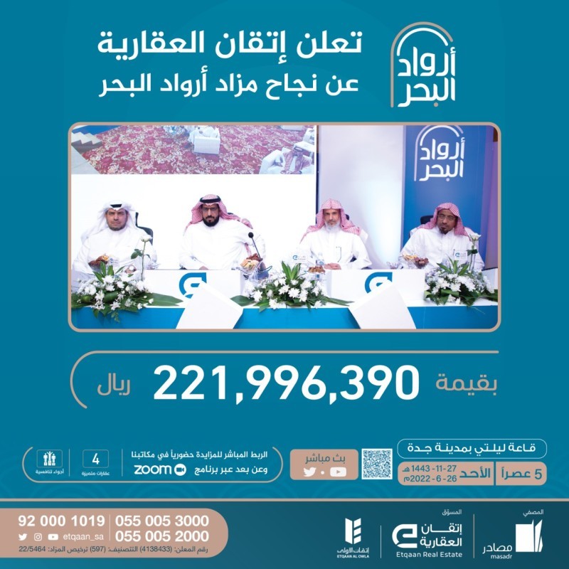أعلنت شركتا إتقان العقارية، وإتقان الأولى نجاح مزاد أرواد البحر بجدة للمصفي شركة مصادر العقارية وأرض جرول بمكة المكرمة للمصفي مجلس التصفية لتركة الشيخ صالح بن عبدالعزيز الراجحي -رحمه الله- بمبيعات بلغت 221.996.390 ريالا، خلال المزاد العلني الذي أقيم عصر أمس (الأحد) بقاعة ليلتي بجدة وتم بثه عبر منصات إتقان وحساباتها في مواقع التواصل الاجتماعي، وسط حضور كثيف وتنافس بين المستثمرين الذي توافدوا من مختلف مناطق المملكة.